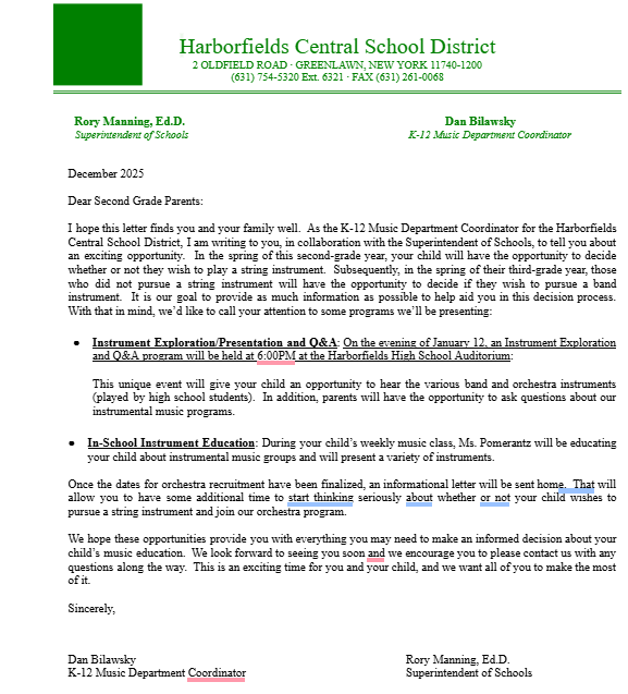INSTRUMENT EXPLORATION - SECOND GRADERS ONLY -Join our High School Music Department on January 12th at 6:00 PM to give your child the opportunity to explore the instruments they can learn to play in 3rd grade. Families will also have time to ask questions and learn more about the program. We hope to see you there! 🎶