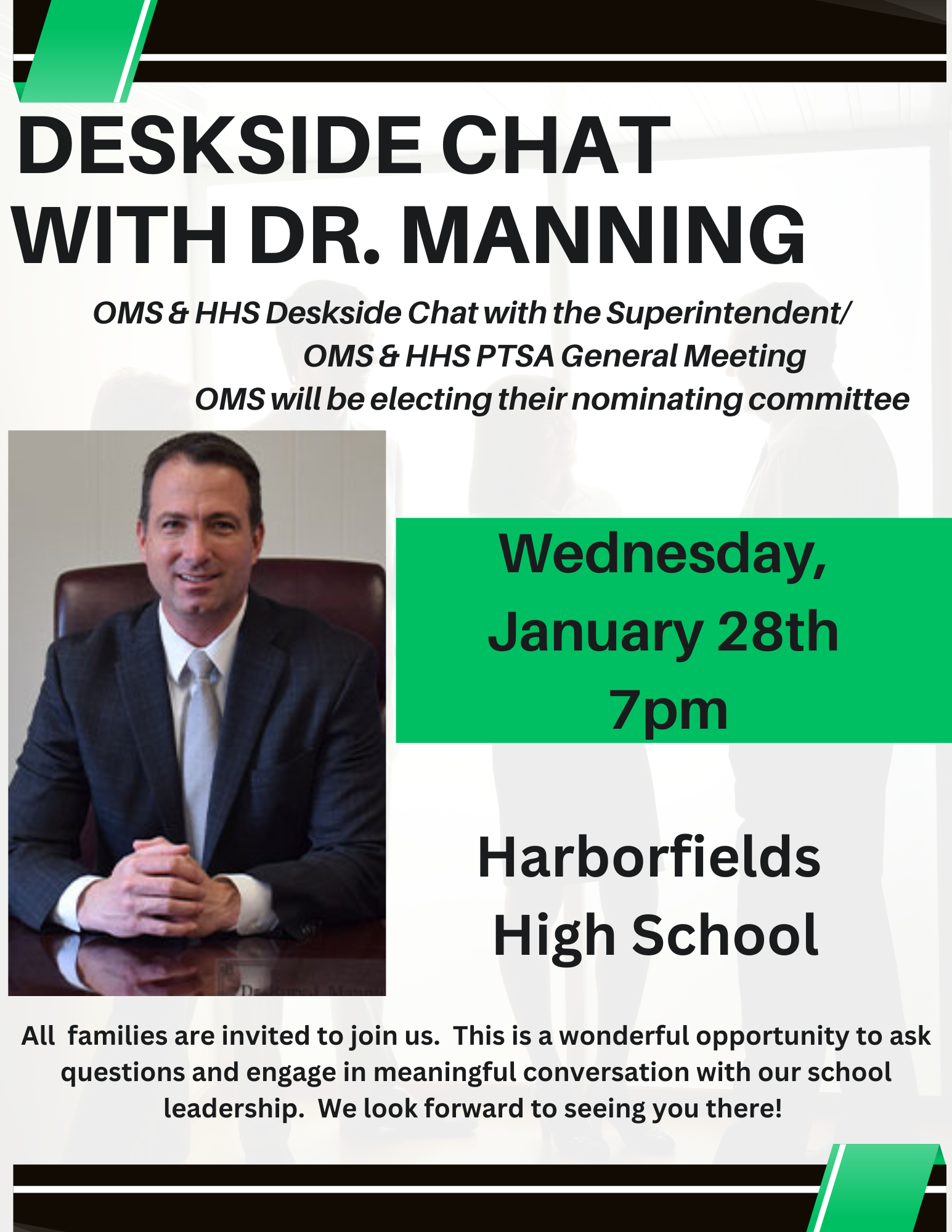 All families are invited to join me on Wednesday, January 28th, at 7:00 p.m., for a deskside chat in the auditorium at Harborfields High School, in collaboration with the OMS and HHS PTAs. This is a wonderful opportunity to ask questions and engage in meaningful conversation. I look forward to seeing you there!
