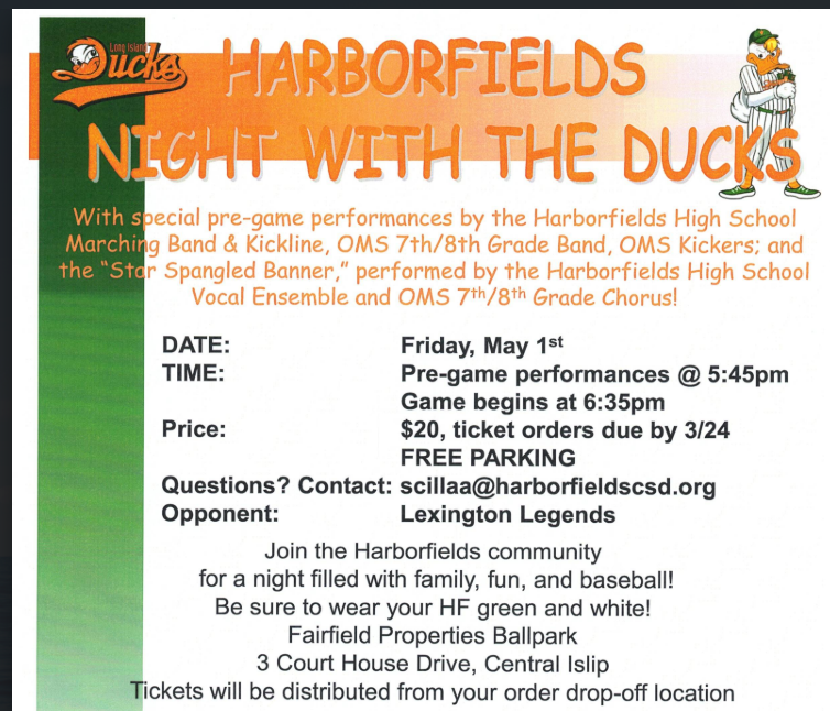 Friday, May 1st, will be "Harborfields Night With the Ducks" at Fairfield Properties Ballpark in Central Islip. The Harborfields High School Marching Band, Kickline, Vocal Ensemble, and the Oldfield Middle School 7th/8th grade band and chorus will give pre-game performances at 5:45 pm, then enjoy the baseball game to follow. We would love for our entire HF community to join us! If you want to sit with a group of people, please either submit one order for everyone or send in the order forms stapled/grouped together!